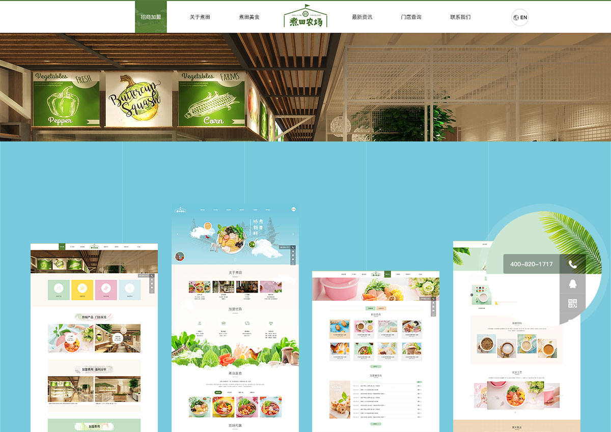 以“農場”“新鮮”為創意設計靈感,將農產品融入網頁背景中;以沉浸式的瀏覽體驗,將煮田農場的產品特色、服務理念及加盟條件娓娓道來,為瀏覽者帶來舒適、溫馨感,同時也完美闡釋煮田農場的網絡形象。