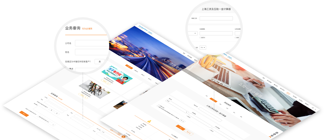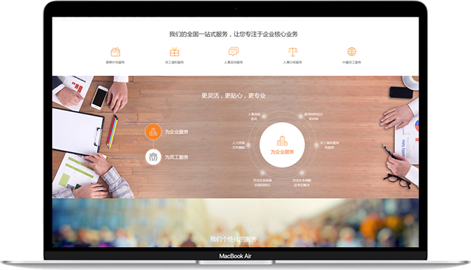 首頁中將業(yè)務(wù)分成“為企業(yè)服務(wù)”和“為員I服務(wù)”兩大類,利用流動的線條將六大核心服務(wù)項目串聯(lián)起來,融合頁面滾動式加載效果,給用戶帶來全新的瀏覽體驗。